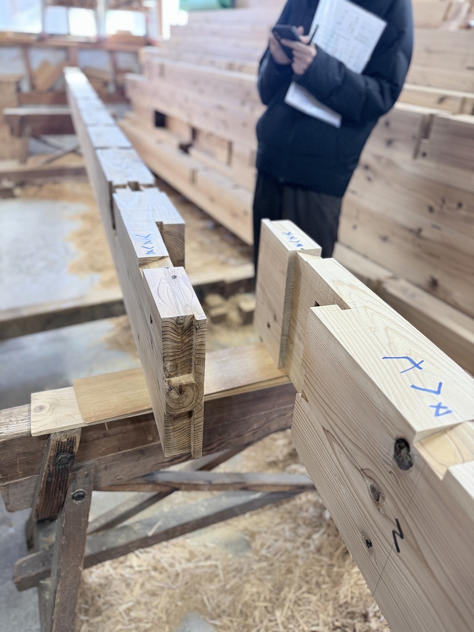 進行中の現場では、構造材の手刻み加工が進んでいます。